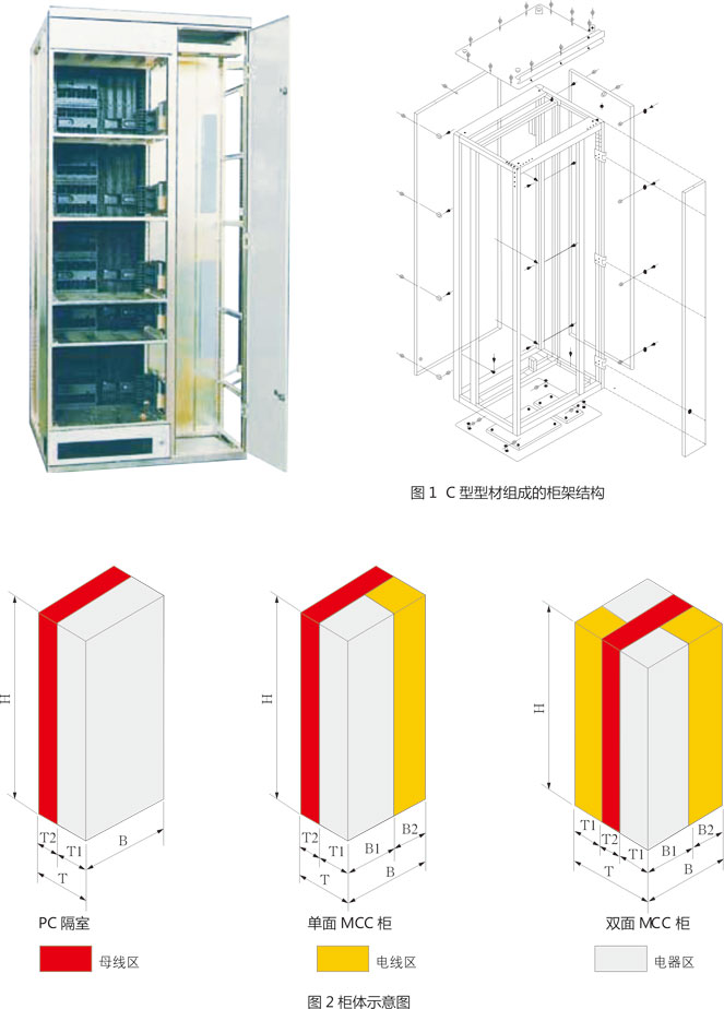 開(kāi)關(guān)柜柜體基本結(jié)構(gòu)是由C型型材料裝配組成。C型材是以E=25mm為模數(shù)安裝孔的鋼板彎制而成。全部柜架及內(nèi)層隔板都作鍍鋅純化處理。四周門板,側(cè)板則作高壓靜電噴塑。柜體基本結(jié)構(gòu)見(jiàn)圖1所示:柜體基本尺寸如表1表2所示: